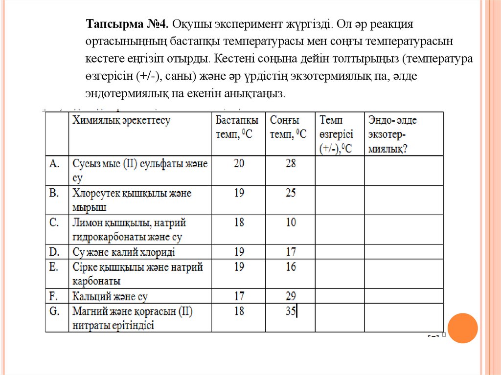 Тапсырма №4. Оқушы эксперимент жүргізді. Ол әр реакцияортасыныңның бастапқы температурасы мен соңғы температурасын