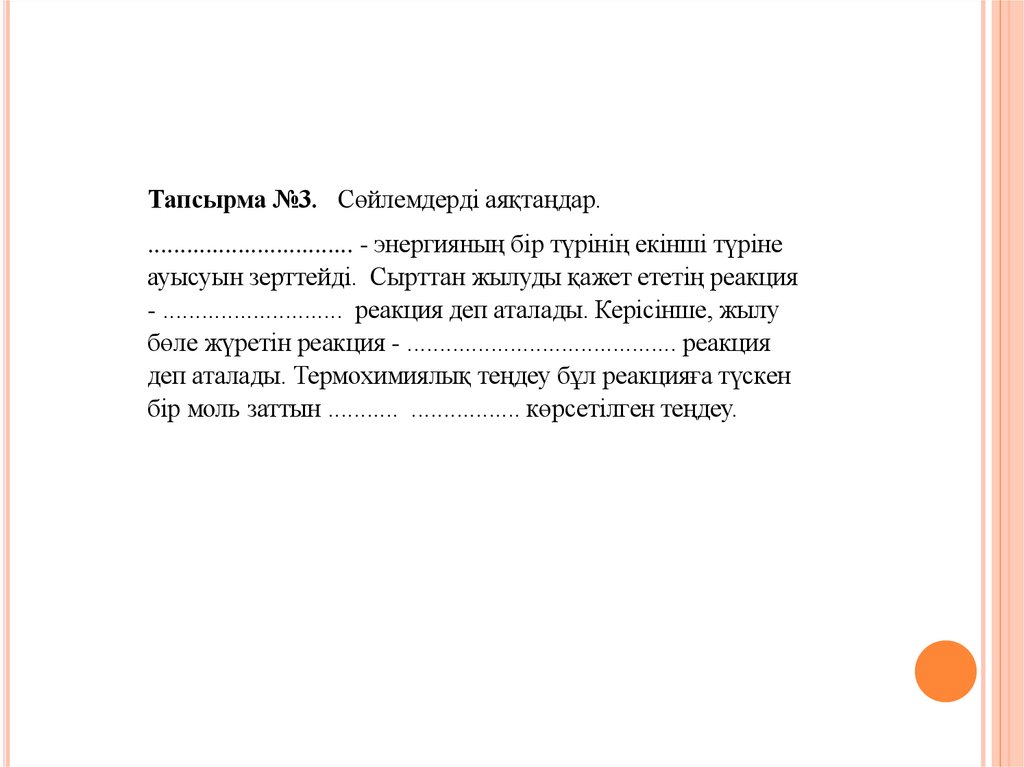 Тапсырма №3. Сөйлемдерді аяқтаңдар................................. - энергияның бір түрінің екінші түріне