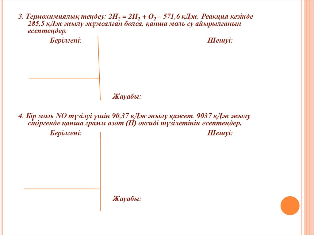 3. Термохимиялық теңдеу: 2H2 = 2H2 + O2 – 571,6 кДж. Реакция кезінде285,5 кДж жылу жұмсалған болса, қанша моль су айырылғанын