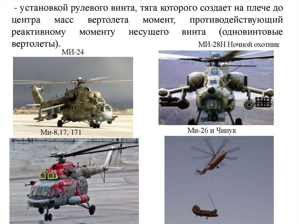 - установкой рулевого винта, тяга которого создает на плече доцентра масс вертолета момент, противодействующий
