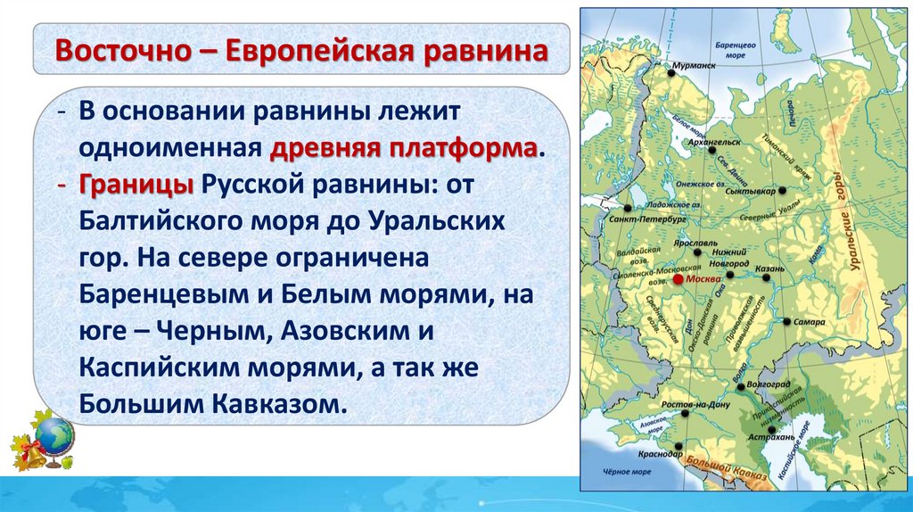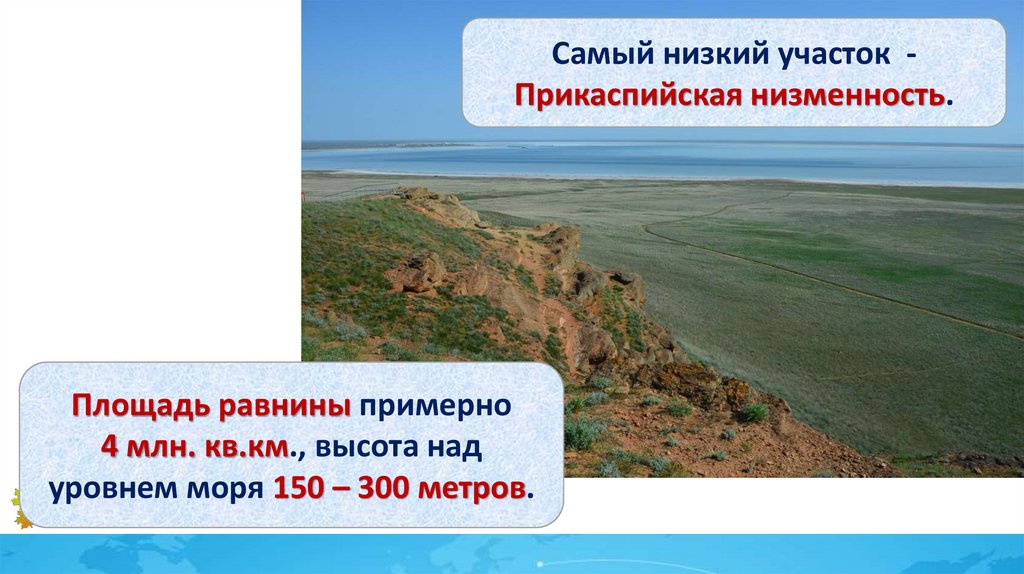 Самый низкий участок Прикаспийская низменность.Площадь равнины примерно