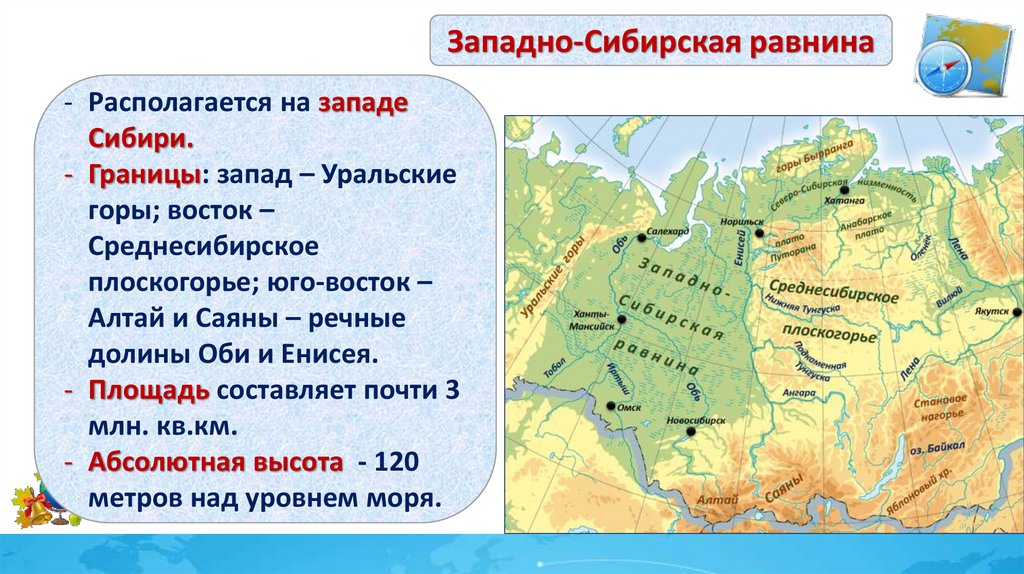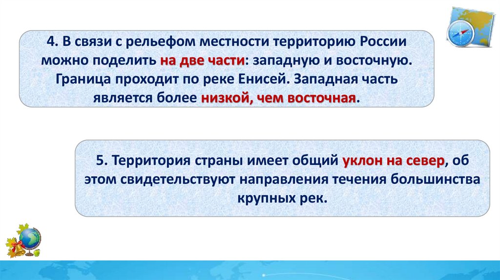 4. В связи с рельефом местности территорию Россииможно поделить на две части: западную и восточную.
