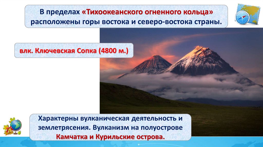 В пределах «Тихоокеанского огненного кольца»расположены горы востока и северо-востока страны.