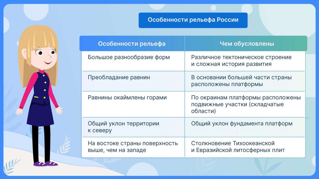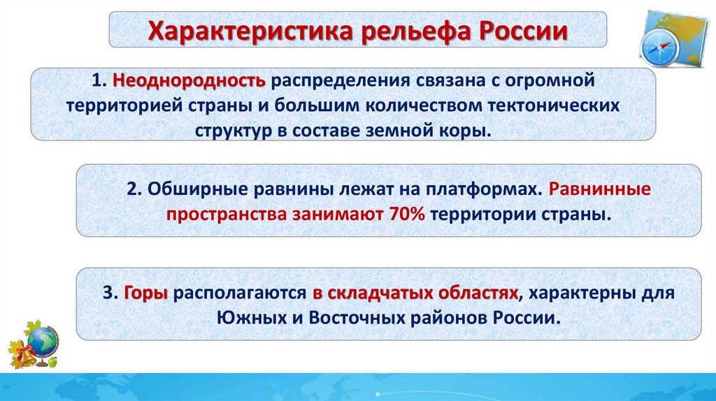 Характеристика рельефа России1. Неоднородность распределения связана с огромной