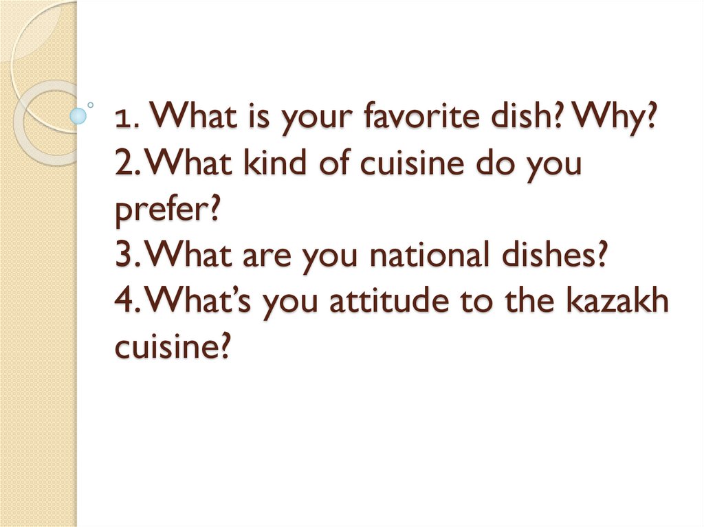 1. 1. What is your favorite dish? Why? 2. What kind of cuisine do you prefer? 3. What are you national dishes? 4. What’s you