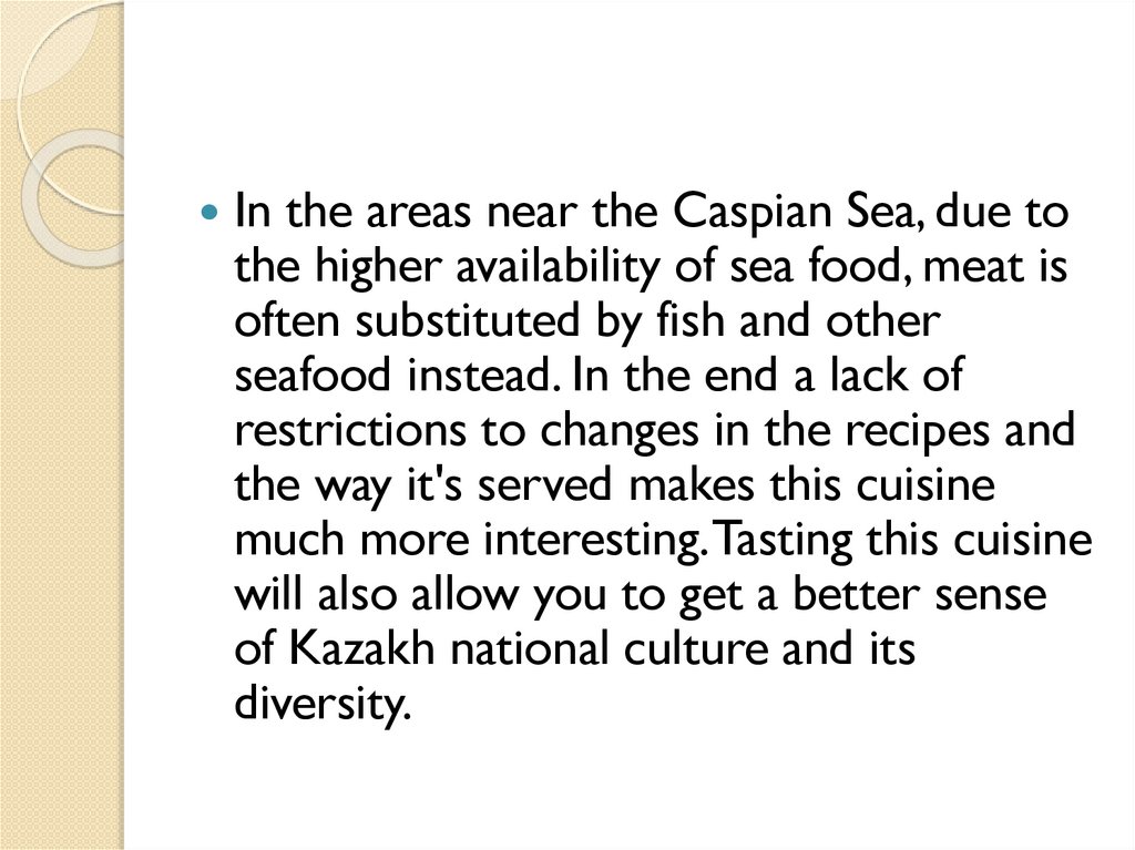 In the areas near the Caspian Sea, due tothe higher availability of sea food, meat is