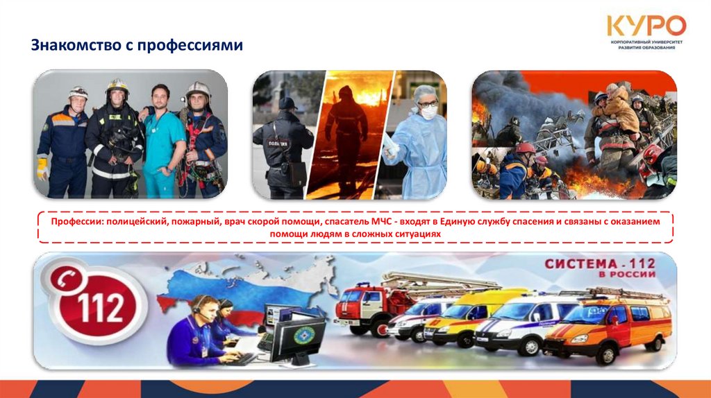 Знакомство с профессиямиПрофессии: полицейский, пожарный, врач скорой помощи, спасатель МЧС - входят в Единую службу спасения и связаны с оказанием