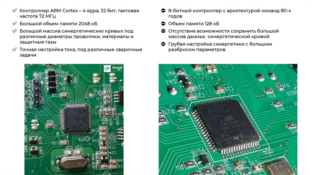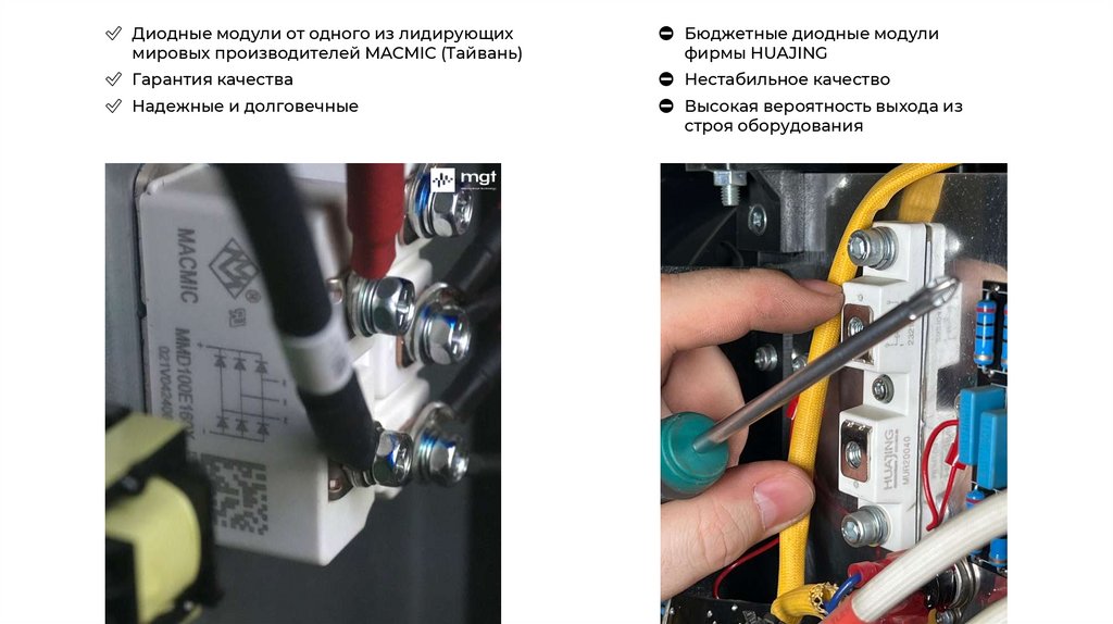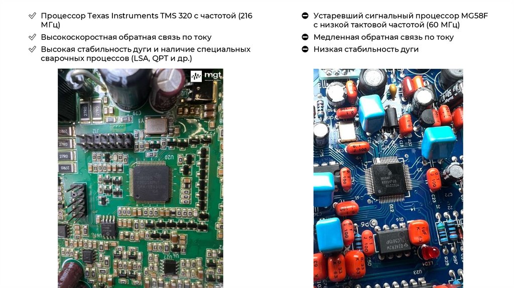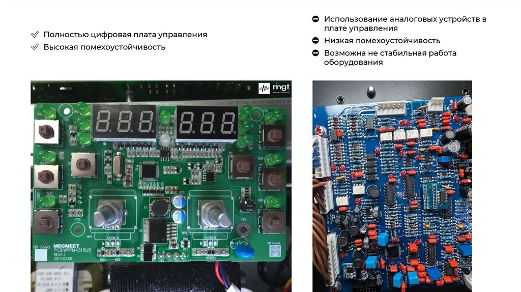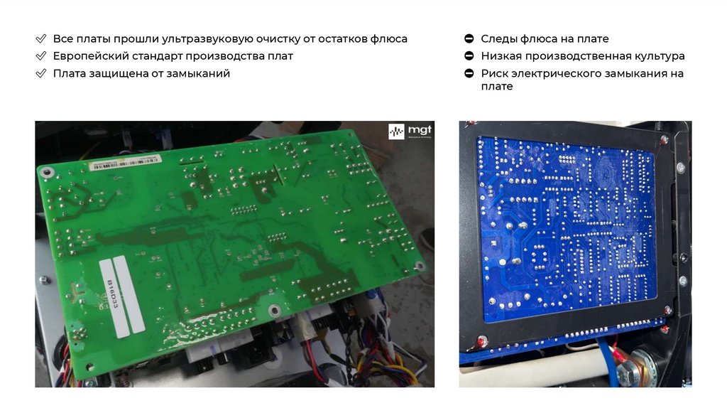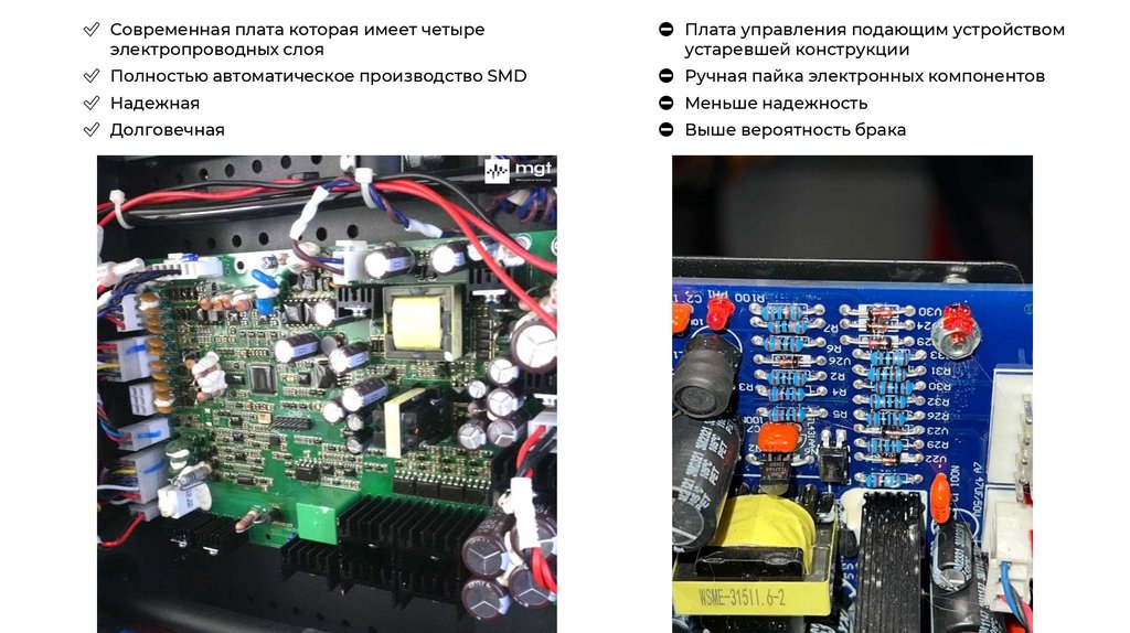 • Надежно? - Вся электроника оборудования mgt производится на передовых высокоточных автоматических линиях SMDмонтажа без участия людей. Все платы изготовлены с учетом высочайших требований надежности из качественных