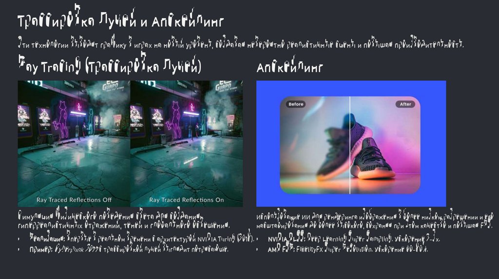 Трассировка Лучей и АпскейлингЭти технологии выводят графику в играх на новый уровень, создавая невероятно реалистичные сцены и повышая производительность.
