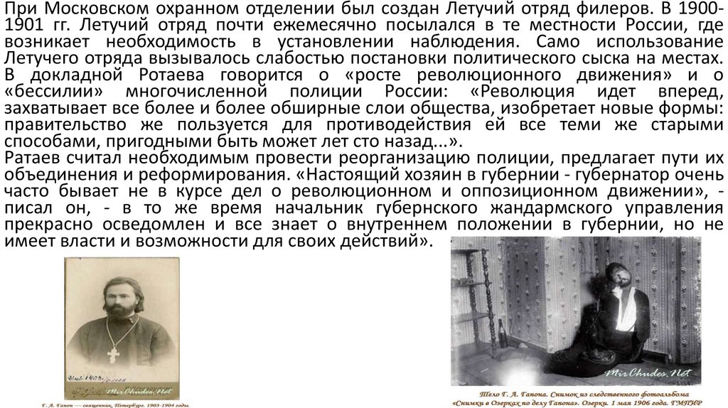 При Московском охранном отделении был создан Летучий отряд филеров. В 19001901 гг. Летучий отряд почти ежемесячно посылался в те местности России, гдевозникает необходимость в установлении наблюдения. Само использование