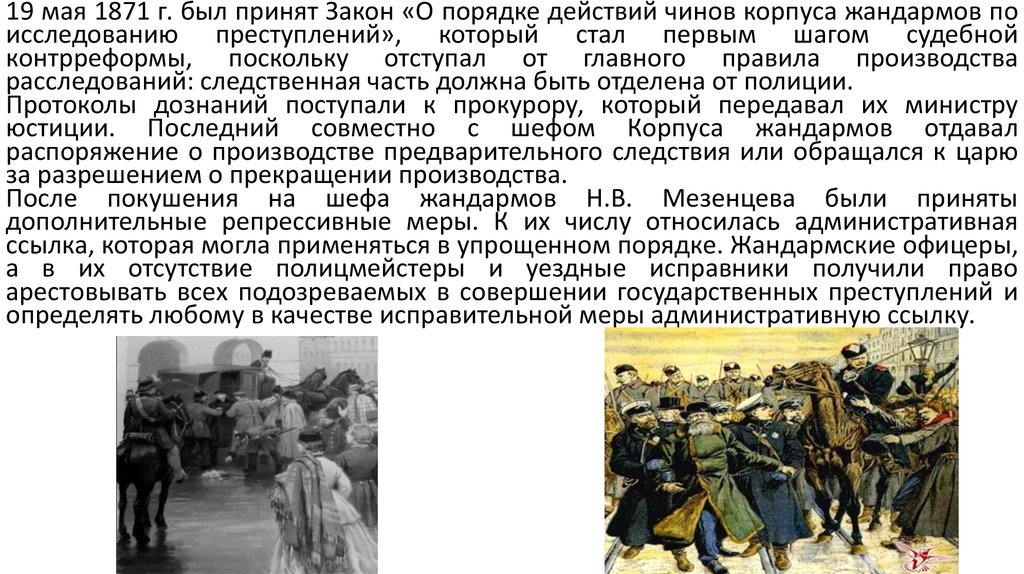 19 мая 1871 г. был принят Закон «О порядке действий чинов корпуса жандармов поисследованию преступлений», который стал первым шагом судебной