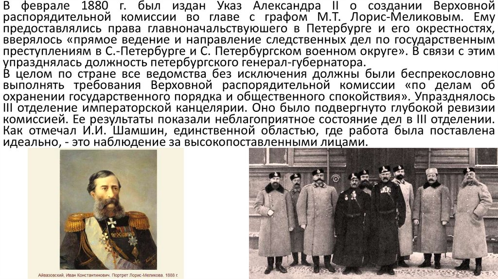 В феврале 1880 г. был издан Указ Александра II о создании Верховнойраспорядительной комиссии во главе с графом М.Т. Лорис-Меликовым. Ему