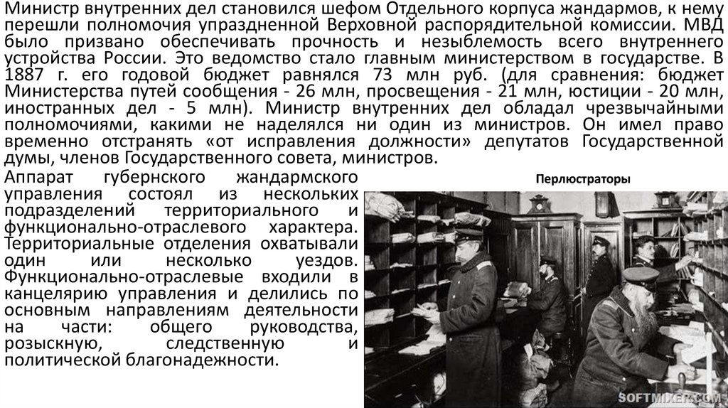 Министр внутренних дел становился шефом Отдельного корпуса жандармов, к немуперешли полномочия упраздненной Верховной распорядительной комиссии. МВД