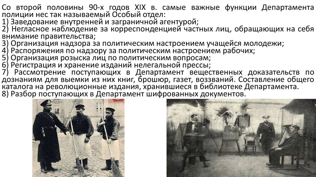 Со второй половины 90-х годов XIX в. самые важные функции Департаментаполиции нес так называемый Особый отдел: