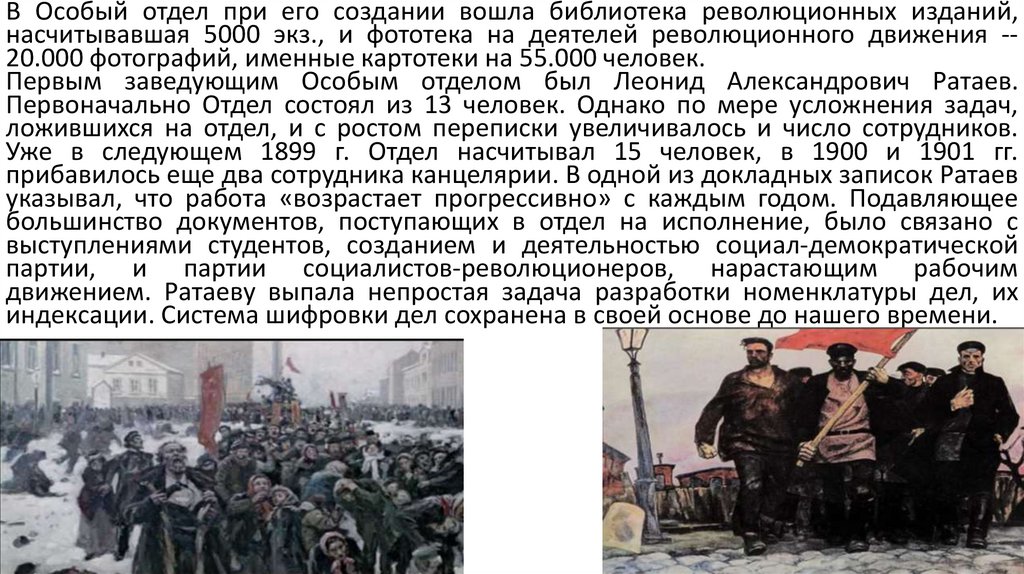 В Особый отдел при его создании вошла библиотека революционных изданий,насчитывавшая 5000 экз., и фототека на деятелей революционного движения -20.000 фотографий, именные картотеки на 55.000 человек.