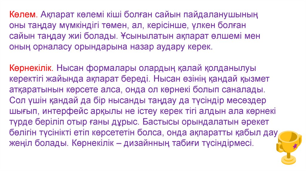 Көлем. Ақпарат көлемі кіші болған сайын пайдаланушыныңоны таңдау мүмкіндігі төмен, ал, керісінше, үлкен болған