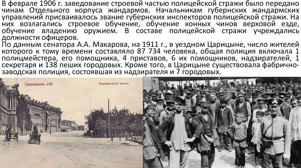 секретаря и 138 пеших городовых. Кроме того, в Царицыне существовала фабричнозаводская полиция, состоявшая из надзирателя и 7 городовых.