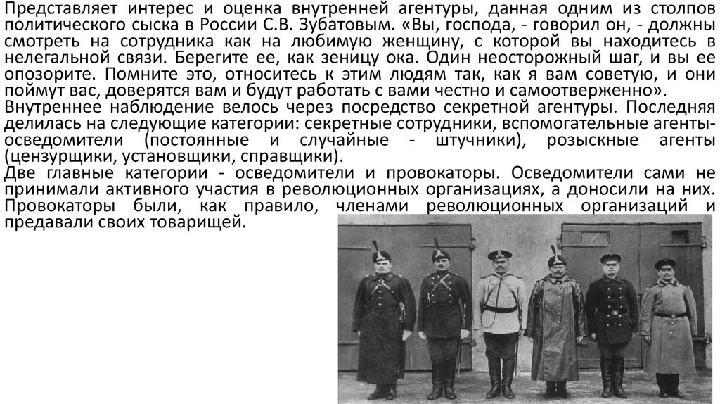 Представляет интерес и оценка внутренней агентуры, данная одним из столповполитического сыска в России С.В. Зубатовым. «Вы, господа, - говорил он, - должны