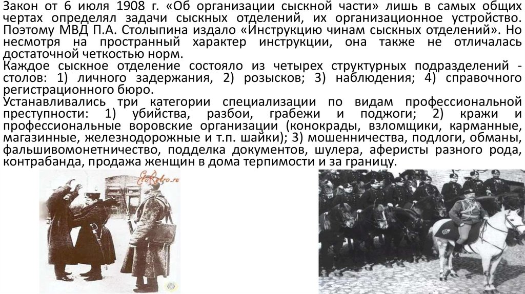 Закон от 6 июля 1908 г. «Об организации сыскной части» лишь в самых общихчертах определял задачи сыскных отделений, их организационное устройство.