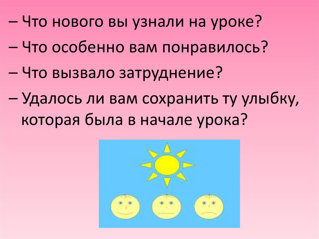 – Что нового вы узнали на уроке?– Что особенно вам понравилось?