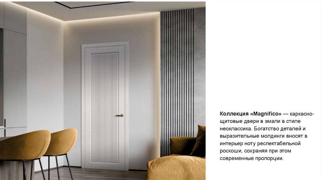 Коллекция «Magnifico» — каркаснощитовые двери в эмали в стиленеоклассика. Богатство деталей и