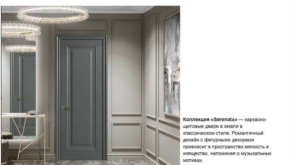 Коллекция «Serenata» — каркаснощитовые двери в эмали вклассическом стиле. Романтичный