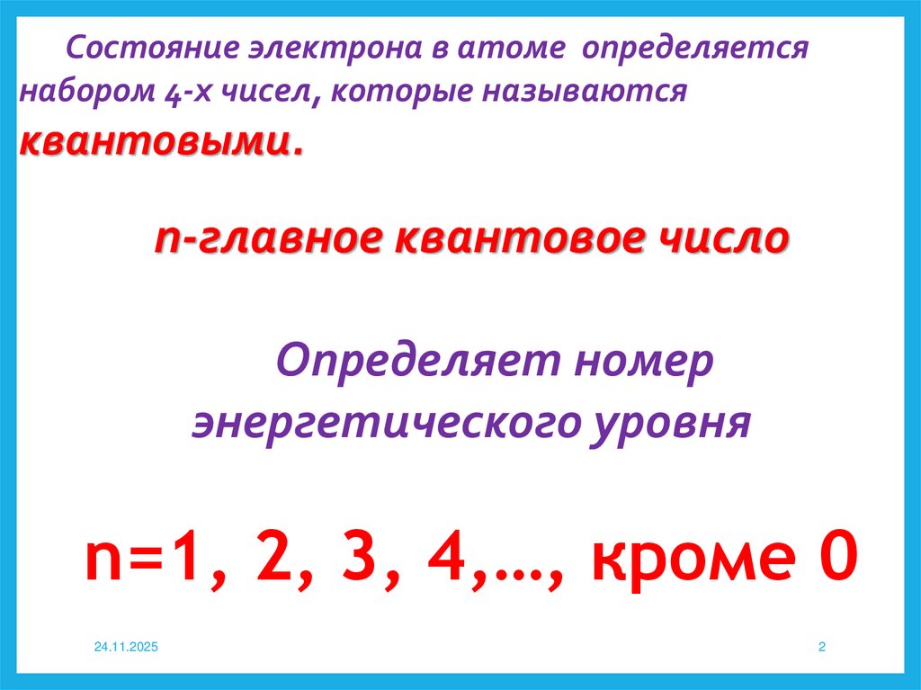 Состояние электрона в атоме определяетсянабором 4-х чисел, которые называются