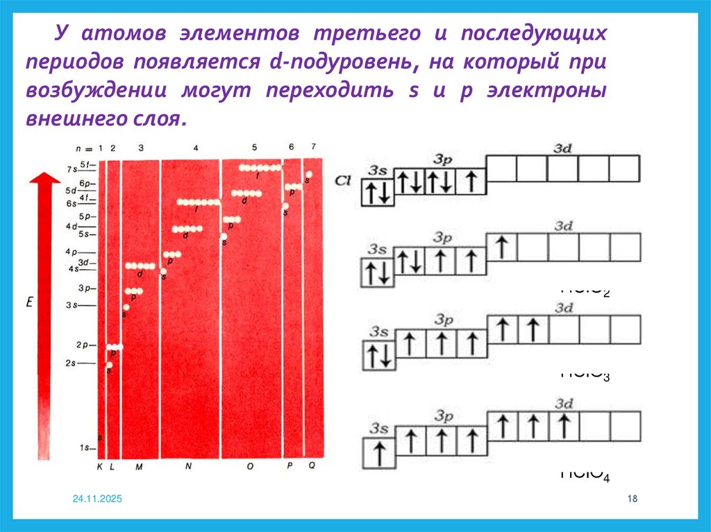 У атомов элементов третьего и последующихпериодов появляется d-подуровень, на который при