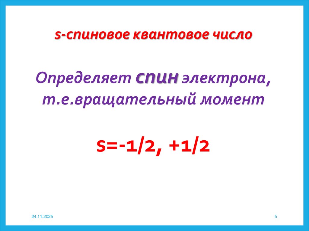 s-спиновое квантовое числоОпределяет спин электрона,