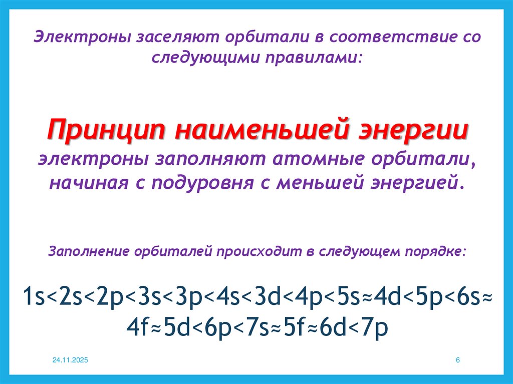 Электроны заселяют орбитали в соответствие соследующими правилами: