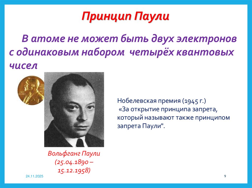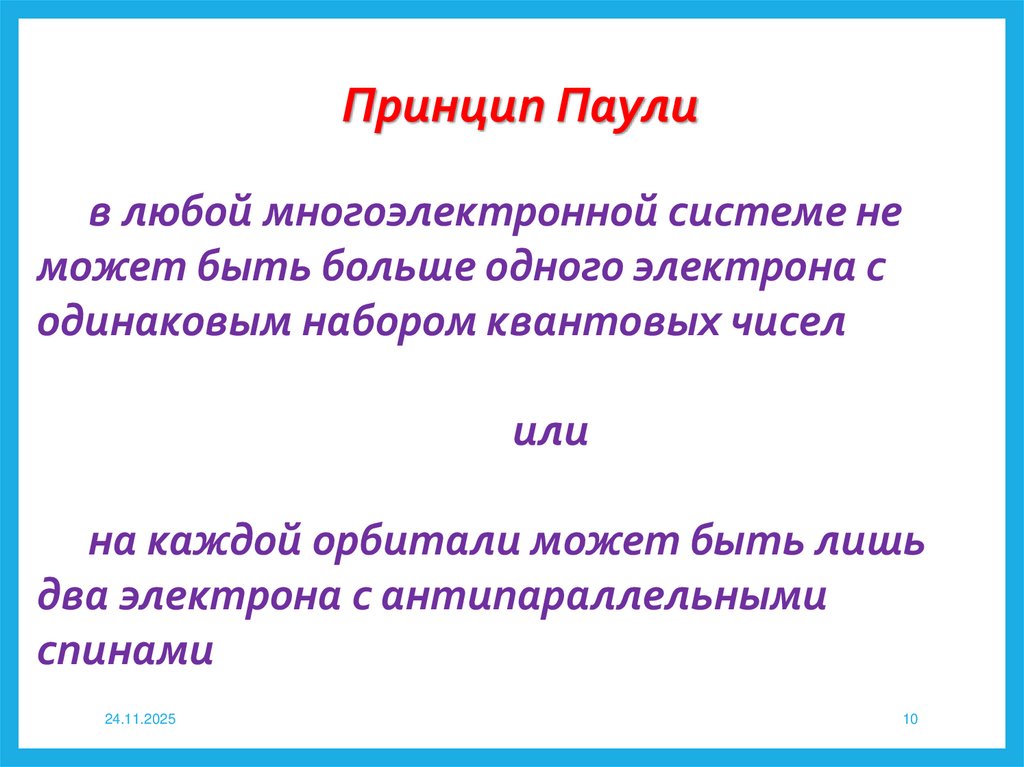 Принцип ПаулиВ атоме не может быть двух электронов