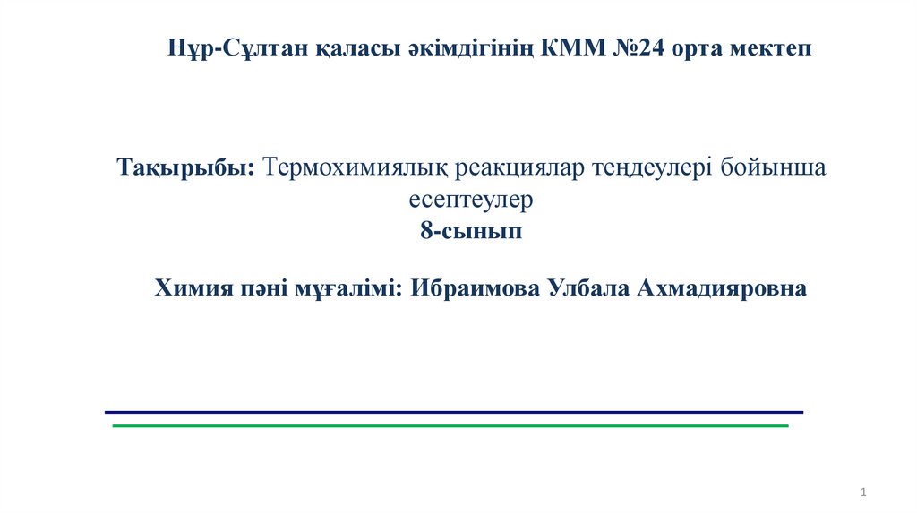 Нұр-Сұлтан қаласы әкімдігінің КММ №24 орта мектепТақырыбы: Термохимиялық реакциялар теңдеулері бойынша