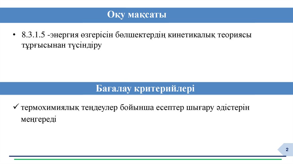 Оқу мақсаты• 8.3.1.5 -энергия өзгерісін бөлшектердің кинетикалық теориясы