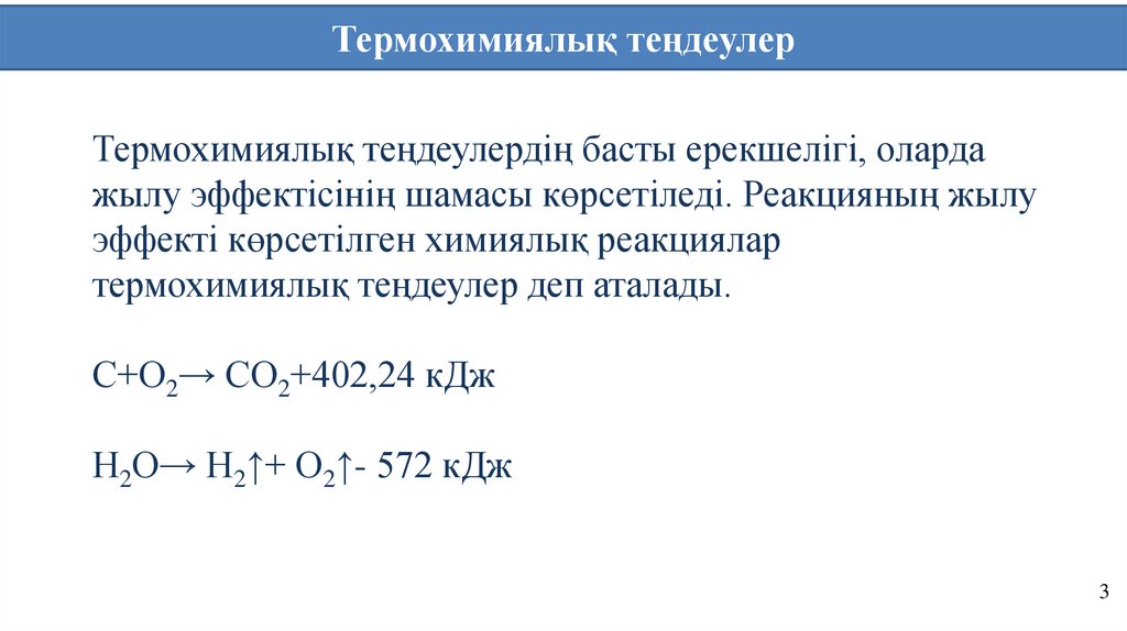 Термохимиялық теңдеулерТермохимиялық теңдеулердің басты ерекшелігі, оларда