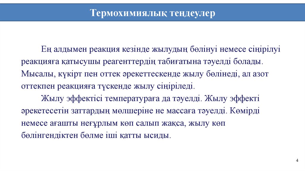 Термохимиялық теңдеулерЕң алдымен реакция кезінде жылудың бөлінуі немесе сіңірілуі