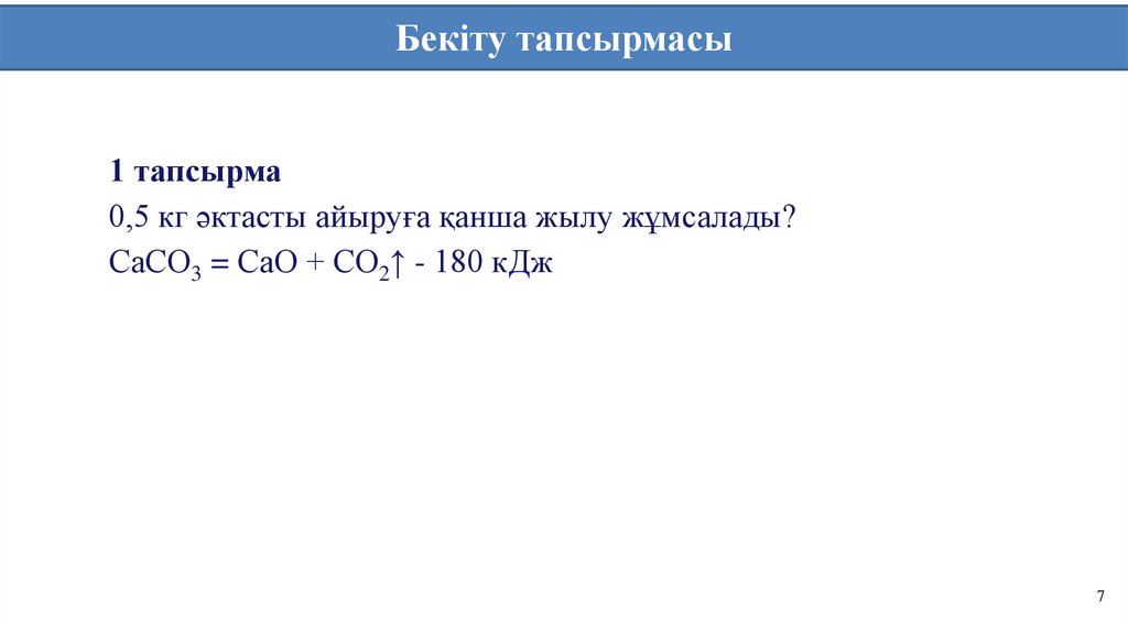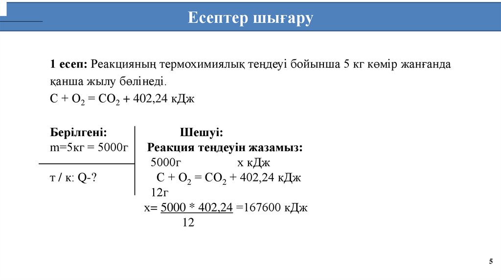 Есептер шығару1 есеп: Реакцияның термохимиялық теңдеуі бойынша 5 кг көмір жанғанда