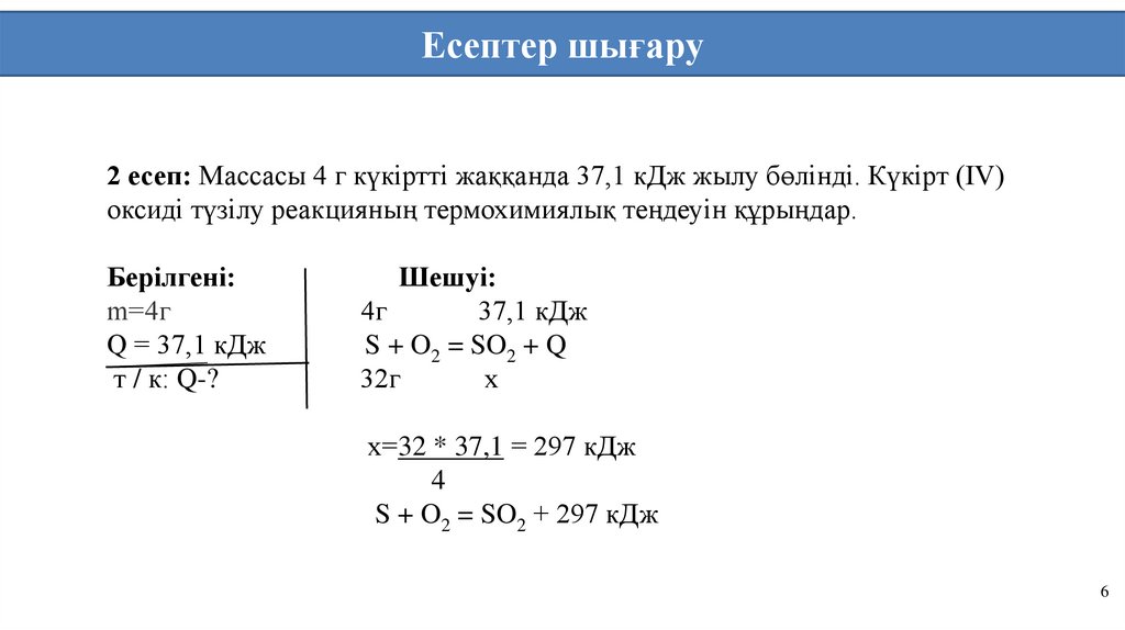 Есептер шығару2 есеп: Массасы 4 г күкіртті жаққанда 37,1 кДж жылу бөлінді. Күкірт (ІV)