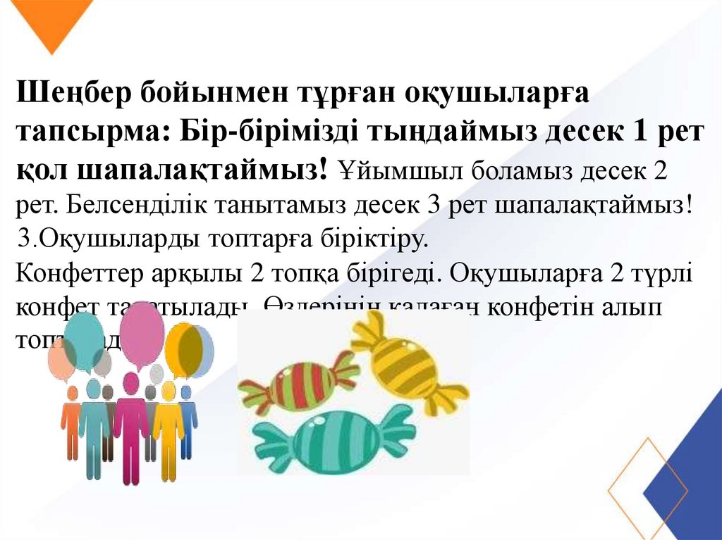 Конфеттер арқылы 2 топқа бірігеді. Оқушыларға 2 түрлі