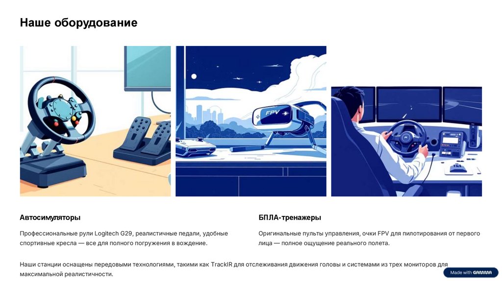 Наши станции оснащены передовыми технологиями, такими как TrackIR для отслеживания движения головы и системами из трех мониторов для