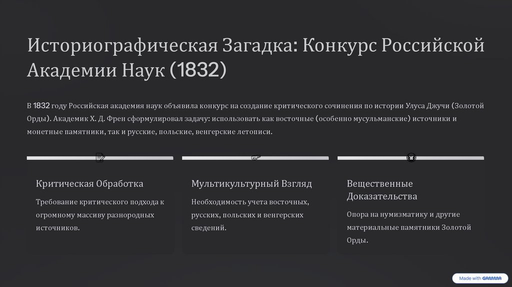 В 1832 году Российская академия наук объявила конкурс на создание критического сочинения по истории Улуса Джучи (Золотой