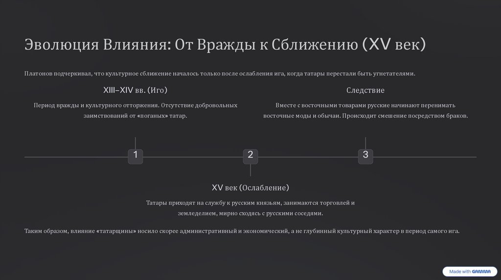 Эволюция Влияния: От Вражды к Сближению (XV век)Платонов подчеркивал, что культурное сближение началось только после ослабления ига, когда татары перестали быть угнетателями.