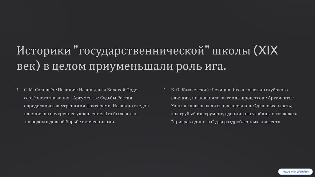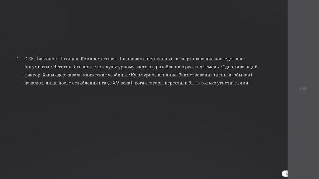 1. С. Ф. Платонов · Позиция: Компромиссная. Признавал и негативные, и сдерживающие последствия. ·Аргументы: · Негатив: Иго привело к культурному застою и разобщению русских земель. · Сдерживающий