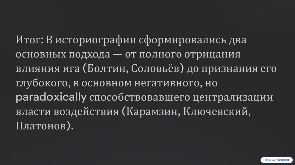 Итог: В историографии сформировались дваосновных подхода — от полного отрицания