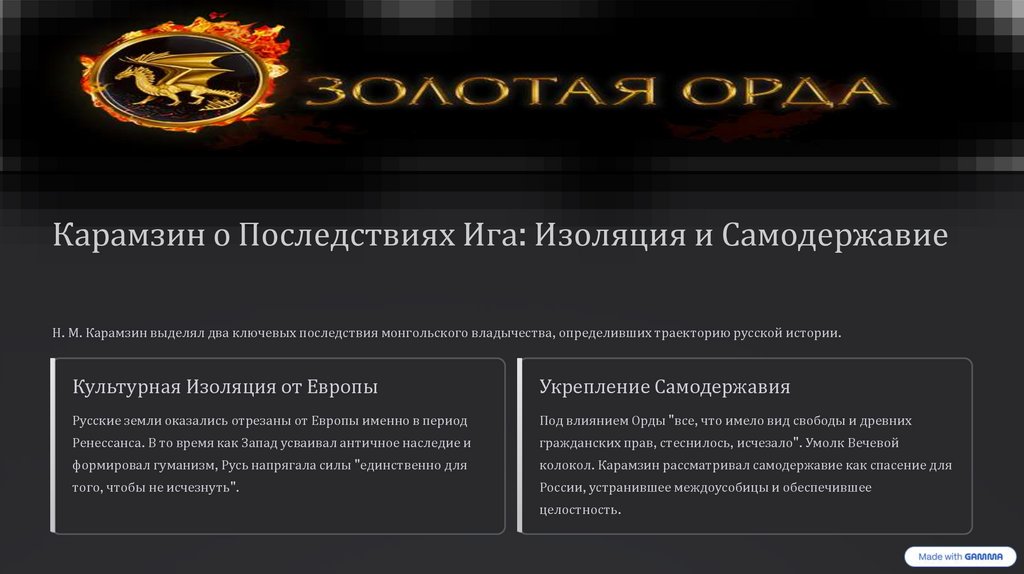 Карамзин о Последствиях Ига: Изоляция и СамодержавиеН. М. Карамзин выделял два ключевых последствия монгольского владычества, определивших траекторию русской истории.