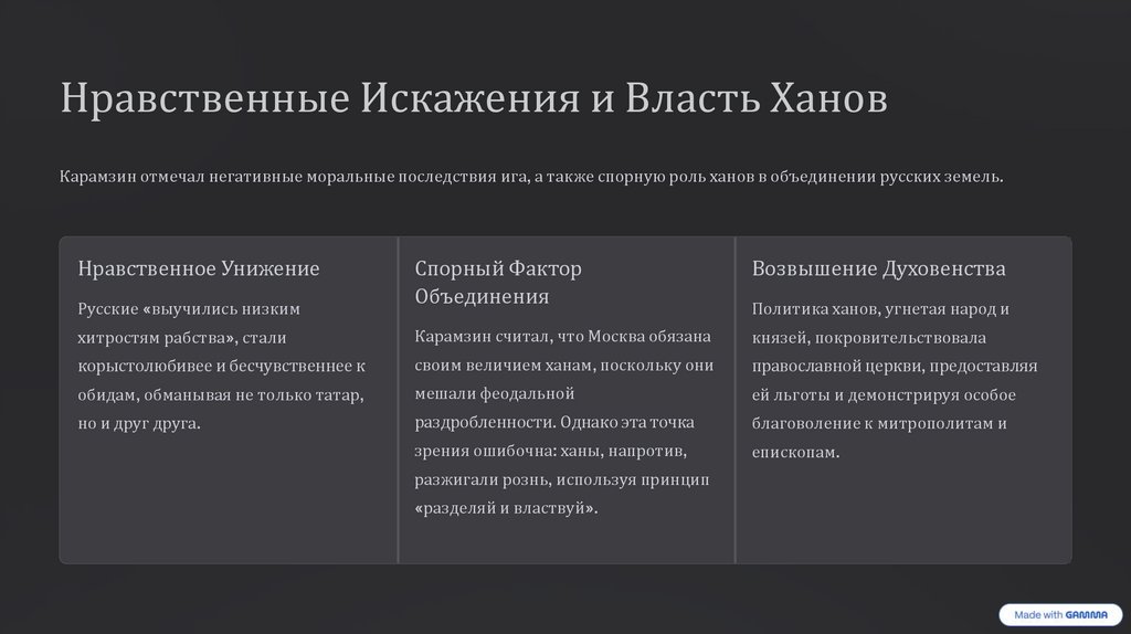 Нравственные Искажения и Власть ХановКарамзин отмечал негативные моральные последствия ига, а также спорную роль ханов в объединении русских земель.