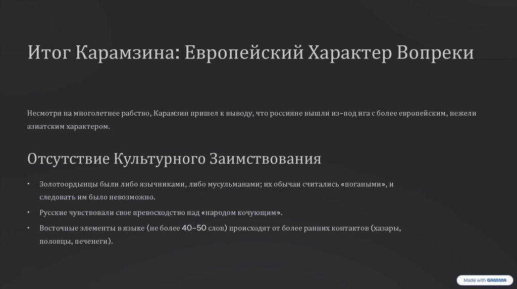 Итог Карамзина: Европейский Характер ВопрекиНесмотря на многолетнее рабство, Карамзин пришел к выводу, что россияне вышли из-под ига с более европейским, нежели