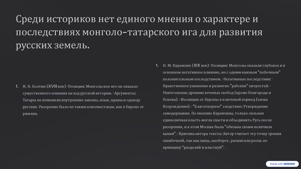 Среди историков нет единого мнения о характере ипоследствиях монголо-татарского ига для развития