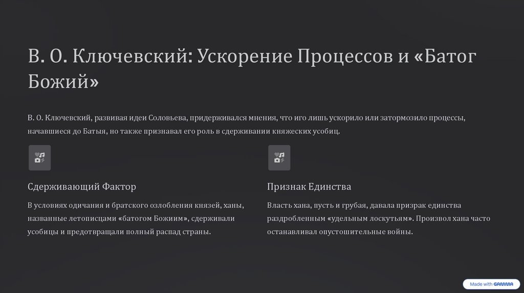 начавшиеся до Батыя, но также признавал его роль в сдерживании княжеских усобиц.