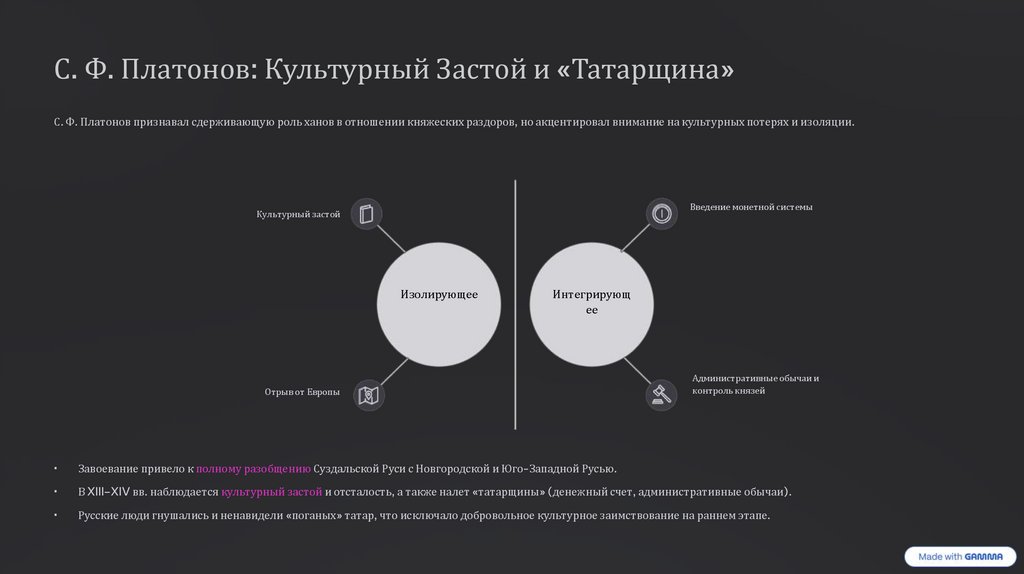 С. Ф. Платонов: Культурный Застой и «Татарщина»С. Ф. Платонов признавал сдерживающую роль ханов в отношении княжеских раздоров, но акцентировал внимание на культурных потерях и изоляции.