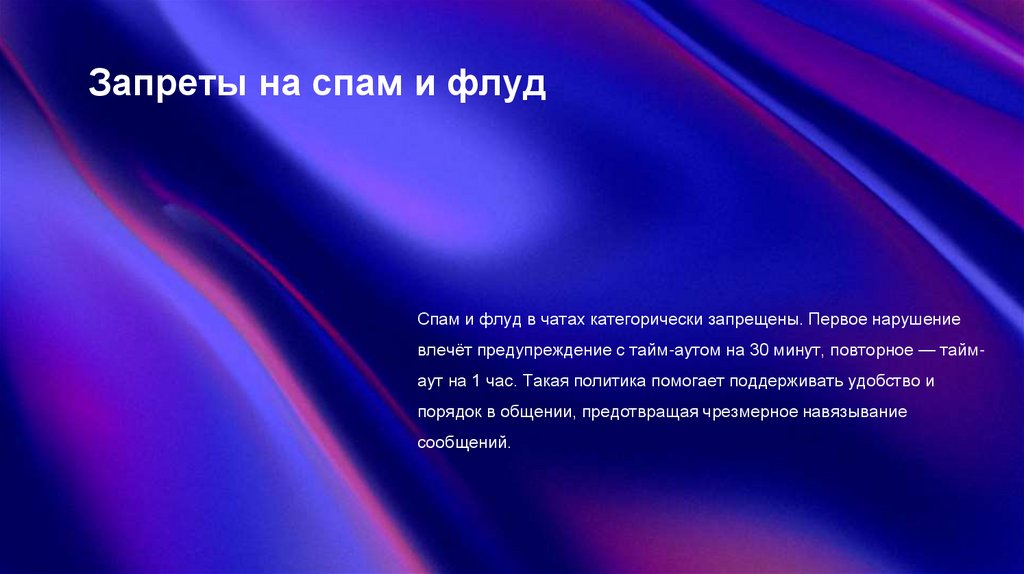 Запреты на спам и флудСпам и флуд в чатах категорически запрещены. Первое нарушение